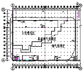 該建筑為2層現(xiàn)澆混凝土框架結(jié)構(gòu),鋼結(jié)構(gòu)屋面,東西方向長411.3m,南北方向?qū)?43.5m,一層層高7m,二層層高6.5m,主體結(jié)構(gòu)高13.7m,軸網(wǎng)尺寸為7mx7.5m、7mx7.7m、7mx7.75m。該建筑東西向共設(shè)有5道伸縮縫、南北向共設(shè)有1道伸縮縫,根據(jù)伸縮縫設(shè)置位置,共分12個區(qū),本次著火區(qū)域及煙氣彌漫區(qū)域為1~11軸/A~K軸、12~22軸/A~K軸、1~11軸/L~V軸、12~22軸/L~V軸區(qū)域,火災(zāi)區(qū)域平面布置見圖1。