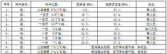 現(xiàn)場采用回彈取芯綜合法對未過火區(qū)域、過火區(qū)域的梁、柱、板混凝土均進(jìn)行了測試,以了解混凝土在過火后的強(qiáng)度退化情況。現(xiàn)場測試時間為2009年12月7日~2009年12月9日,測試結(jié)果見表2~表3。根據(jù)