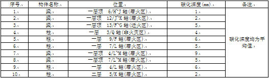 受火災(zāi)影響的混凝土碳化深度,火焰燃燒區(qū)平均為4mm,煙氣彌漫區(qū)域構(gòu)件混凝土因未受明顯影響,且該混凝土為近期施工,其碳化深度平均為0~4mm左右。