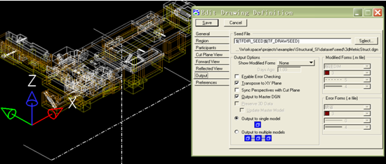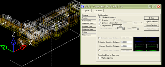 通過簡要的敘述介紹該軟件剖切剖面的過程。進入Drawing Extracting Manager后,點擊“Create a Drawing Definition”,建立一個剖切定義;在“General”中命名該剖切定義;接下來在“Region”中可以通過兩點或者一個面來確定剖切位置,并在此定義剖視方向和剖切的前視、后視距離;在“Cut Plane View”中定義剖切線的線性、顏色、是否填充等信息;在“Forward View”和“Reflected View”中分別定義前視和后視看到的看線的線性、顏色等信息;在“Output”菜單中選擇種子文件,一般都為默認種子文件即可;并在此處勾選“Transpose to XY plane”和“Output to Master DGN”,第一個勾選表示剖切出來的剖面會自動在XY平面上表示,第二個勾選表示剖切出來的文件作為一個單獨視圖自動合并在主模型文件中,并且勾選上“Output to Single Model”表示只生成一個剖切文件。見下圖所示
