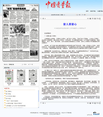 《中國質量報》以“留人要留心--中冶建筑研究總院創新人才機制提升人才管理水平”為題撰文指出,中冶建研院在果斷作出 “回歸科研主業,整合優勢資源,以研發為核心支撐5大板塊發展”的重大戰略決策后,提出“有為才有位”的用人方針,通過組織考核與崗位競聘相結合的方式,選拔和培養青年管理人員,讓合適的人干合適的事,拓展人才上升渠道;搭建了“兩院院士-首席專家-青年科技人才”3級人才梯隊;制定了《首席專家管理辦法》;出臺了《青年科技人才管理辦法》,并從劍橋大學、清華大學等國內外著名院校中吸引優秀學生加入企業,參與“青年科技人才”培養計劃。