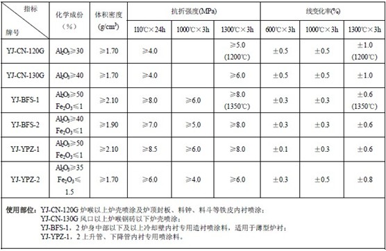 高爐基建用噴涂料采用粘土熟料和輕質莫來石等為主要原料,同時采用了超微粉技術和多種外加劑,使該料具有強度高、體積穩定性好和易施工等優點。