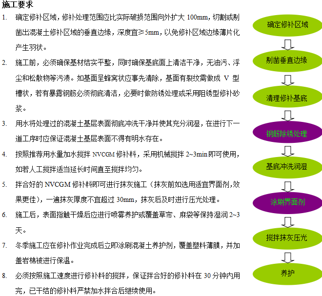 NVCGM高性能修補料是一種有機和無機材料復合的高性能混凝土修補材料,該材料由膠凝材料、多種高分子聚合物改性劑以及抗裂纖維組成,兼具良好的施工和易性、粘接性、抗裂性、耐久性、鋼筯阻銹等性能。廣泛應用于混凝土結構的保護、修補和加固。